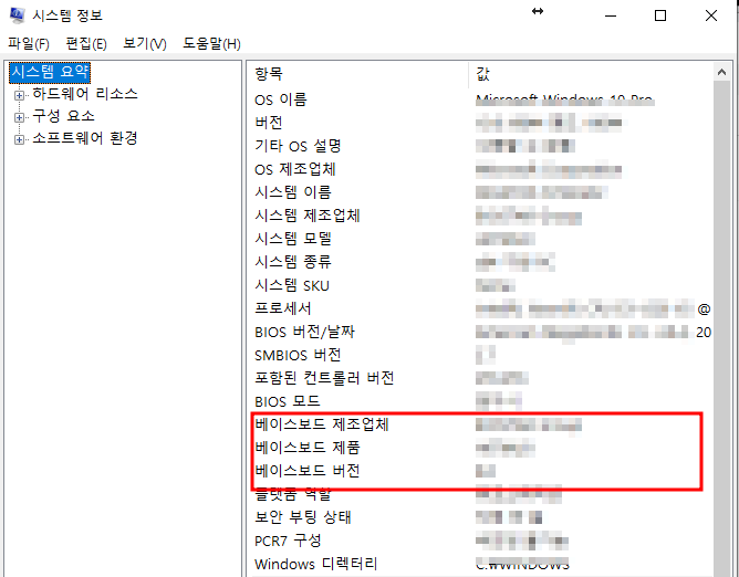 시스템 정보 창을 통해 메인보드 모델명 확인 방법