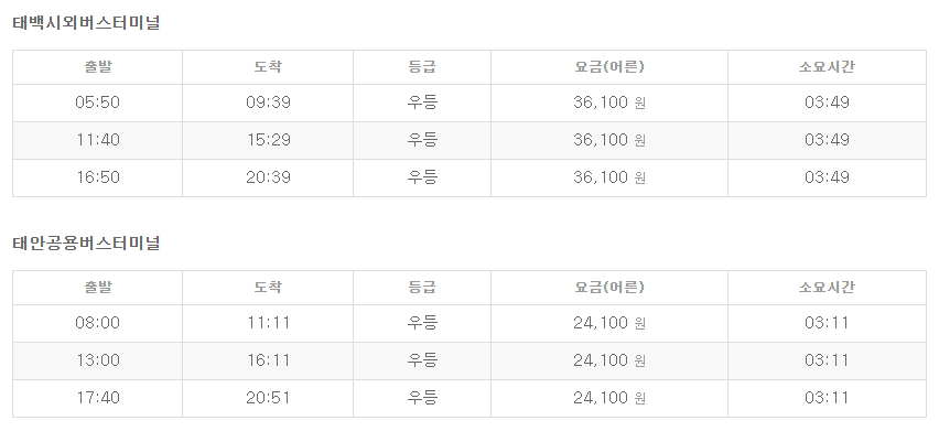 태백시외버스, 태안공용버스터미널 등으로 진행하는 출발 도착 안내입니다.