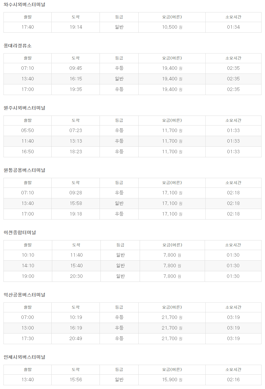 부산종합터버스터미널, 서산 공용버스터미널, 속죠 시외버스터미널, 신남시외버스터미널, 와수시외버스터미널, 용대리정류소, 원주시외버스터미널, 원동공용버스터미널, 이천 종합터미널, 익산 공용버스터미널, 인제시외버스터미널 등으로 진행하는 출발 도착 안내입니다.