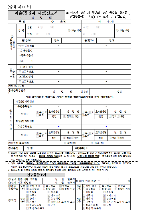 오늘은 이혼신고서 양식 다운로드 파일이 어디에 있는지를 알아보려 한다. 법원 사이트에 있긴 하지만 아래 링크 게 올려놓은 자료를 이용해 보도록 하자. 우리는 협의 이혼을 하든 조정이혼을 하든 소송이혼을 하던 어떤 것을 선택하든 간에 이혼 신고서를 관공서에 제출해서 신고해야지만 가능하다.